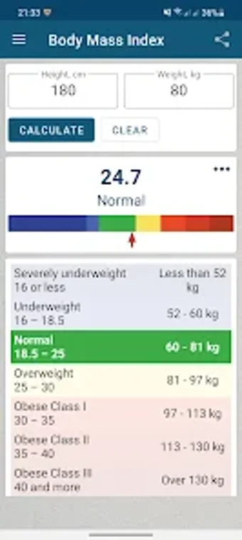 Il calcolatore BMI utilizza uno slider per il risultato, il che rende possibile vedere visivamente il peso corrispondente a ciascun indicatore.